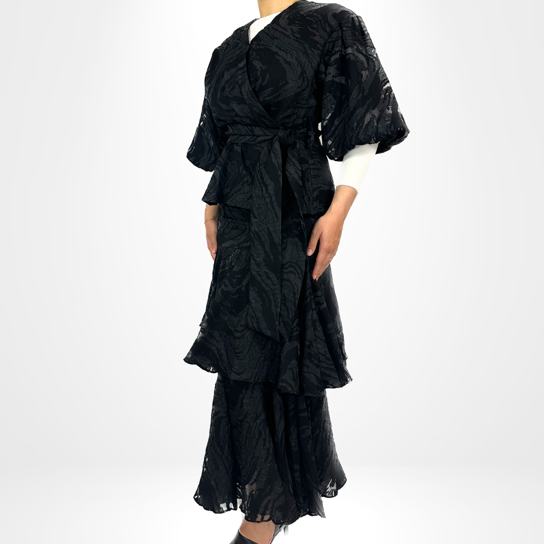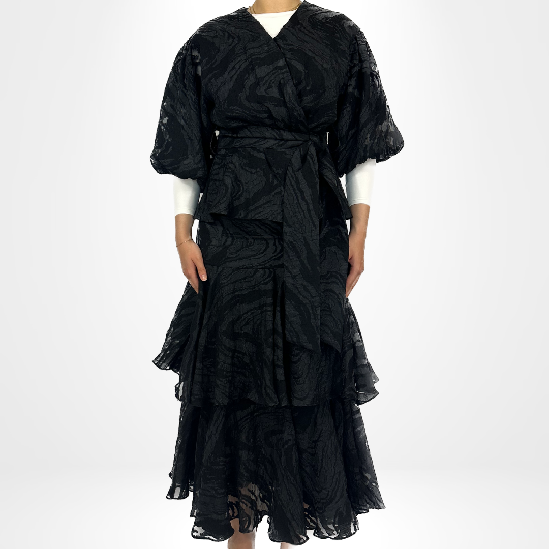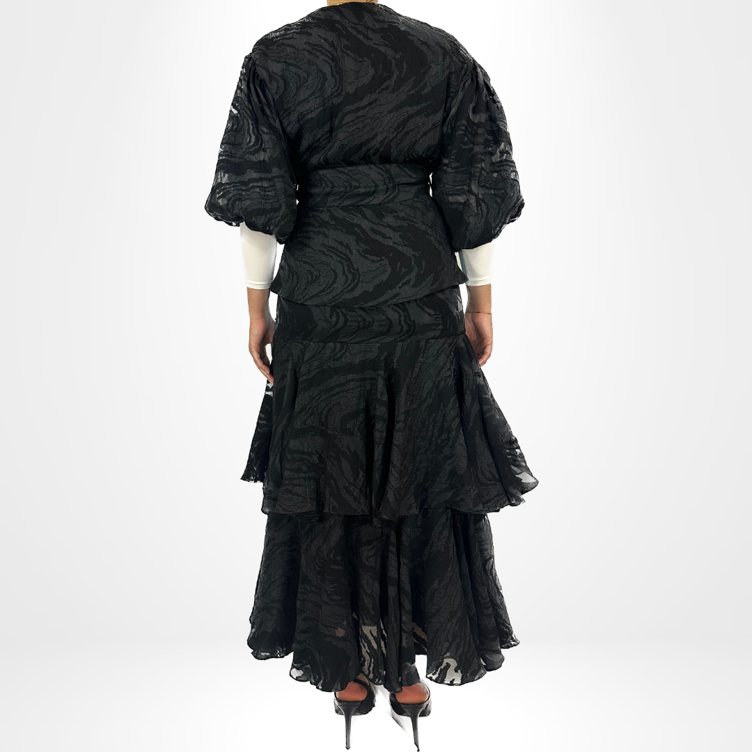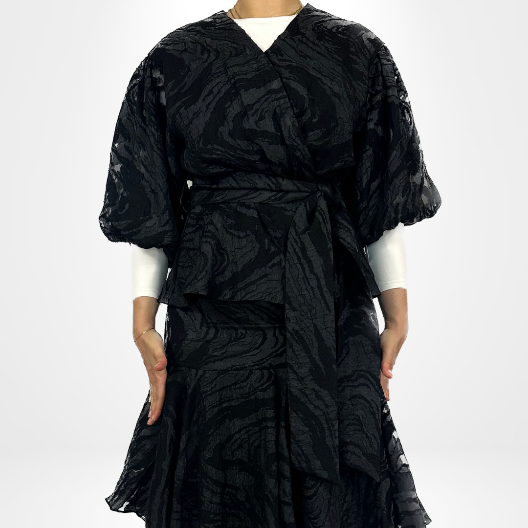 Elevate your wardrobe with our Black Ruffle Skirt set. Featuring a wrap around tie top and a stunning ruffle skirt, this two piece set offers versatility and style. Made with modesty in mind, this set is also available in yellow. Indulge in the flexibility of wearing the top and skirt separately, or together for a complete look.