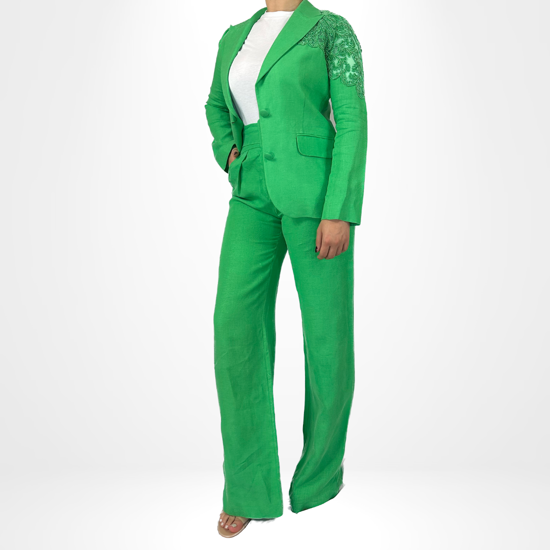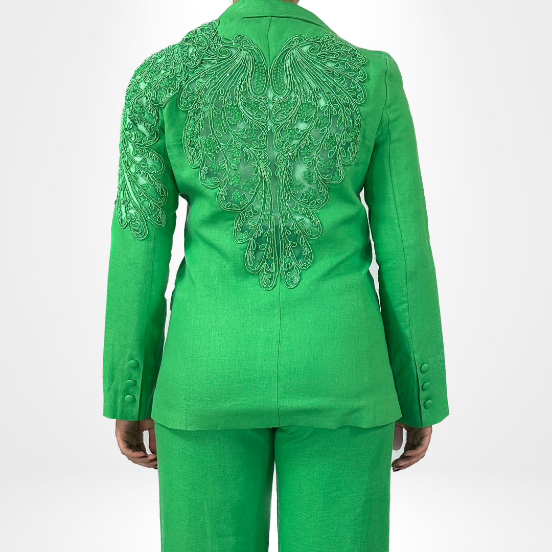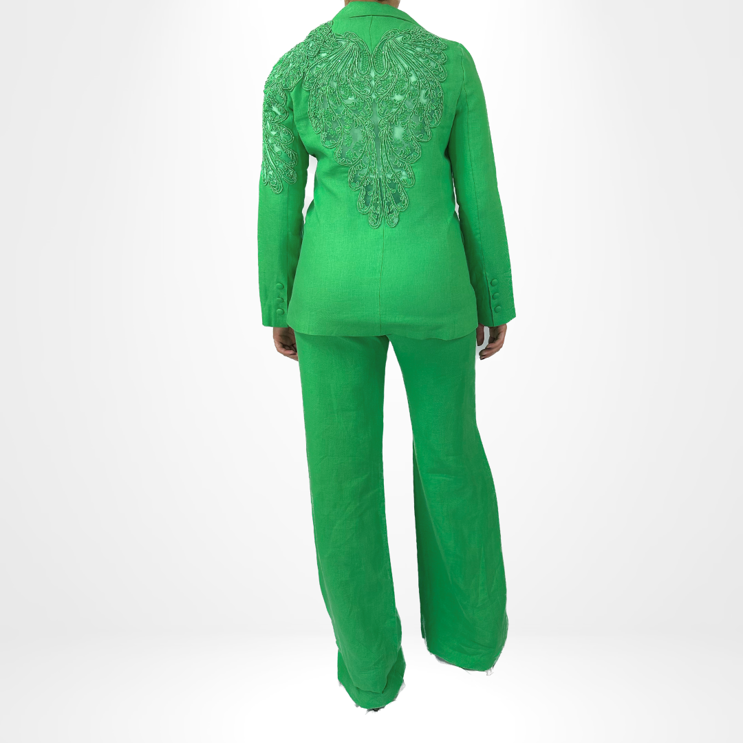 Introducing our Emerald Majesty Suit, featuring a stylish 2-piece blazer set. The blazer and pants are intricately detailed with unique accenting on the sleeves and back. Elevate your professional wardrobe with this sophisticated and eye-catching suit.