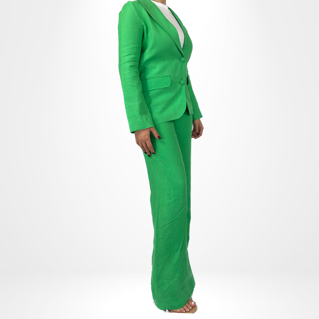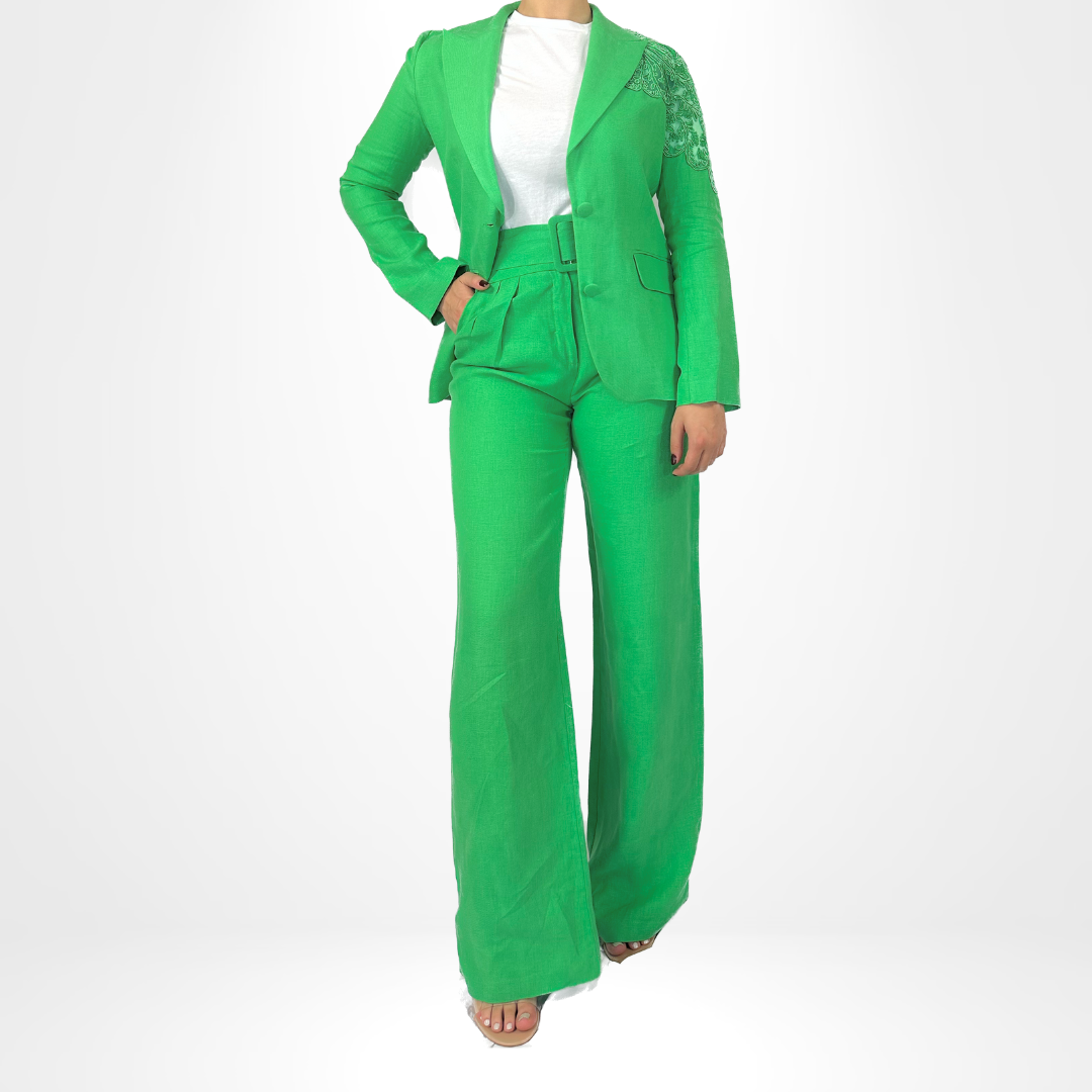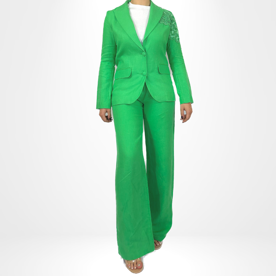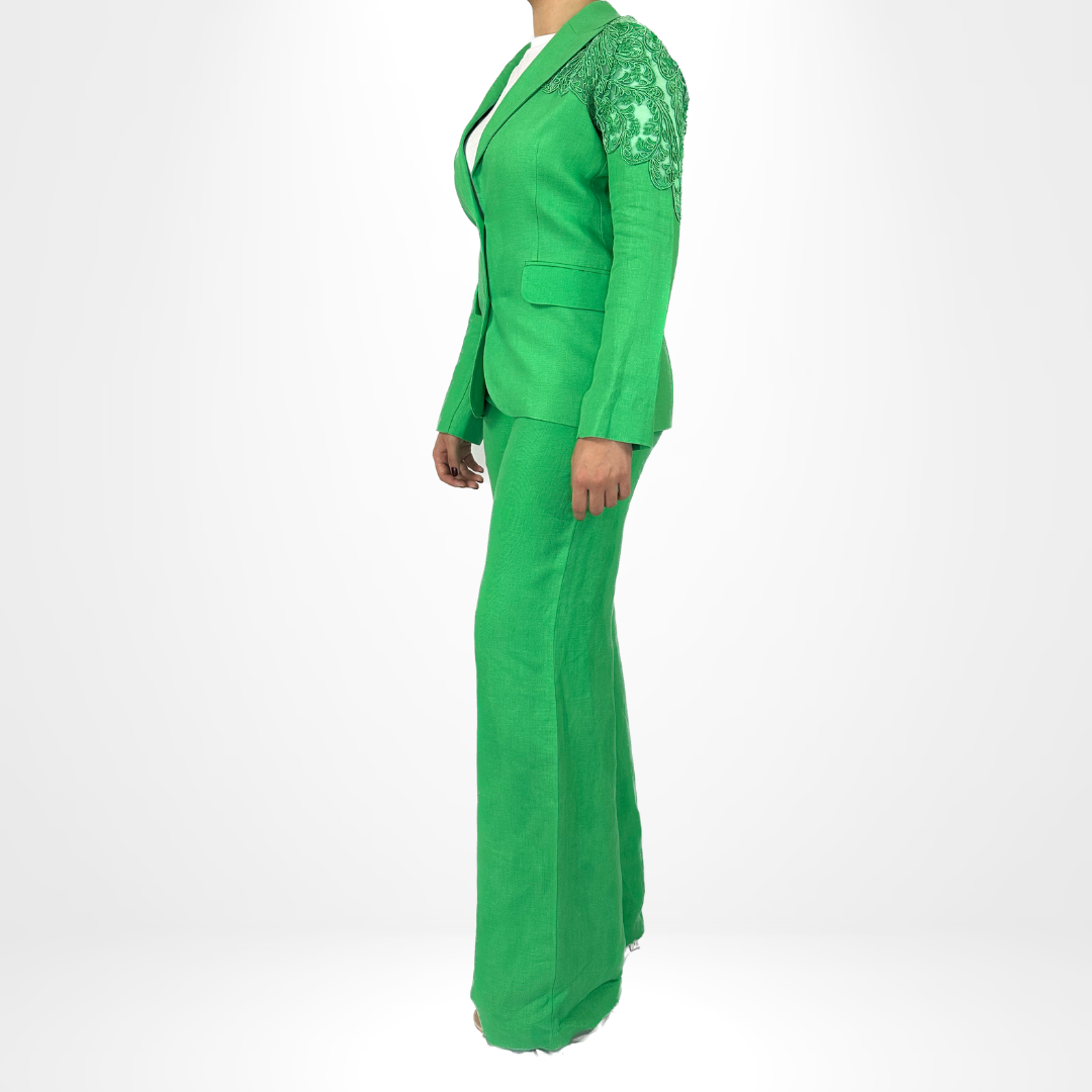 Introducing our Emerald Majesty Suit, featuring a stylish 2-piece blazer set. The blazer and pants are intricately detailed with unique accenting on the sleeves and back. Elevate your professional wardrobe with this sophisticated and eye-catching suit.