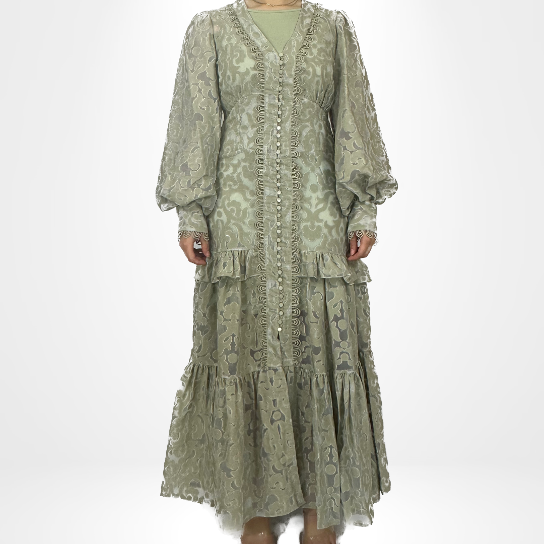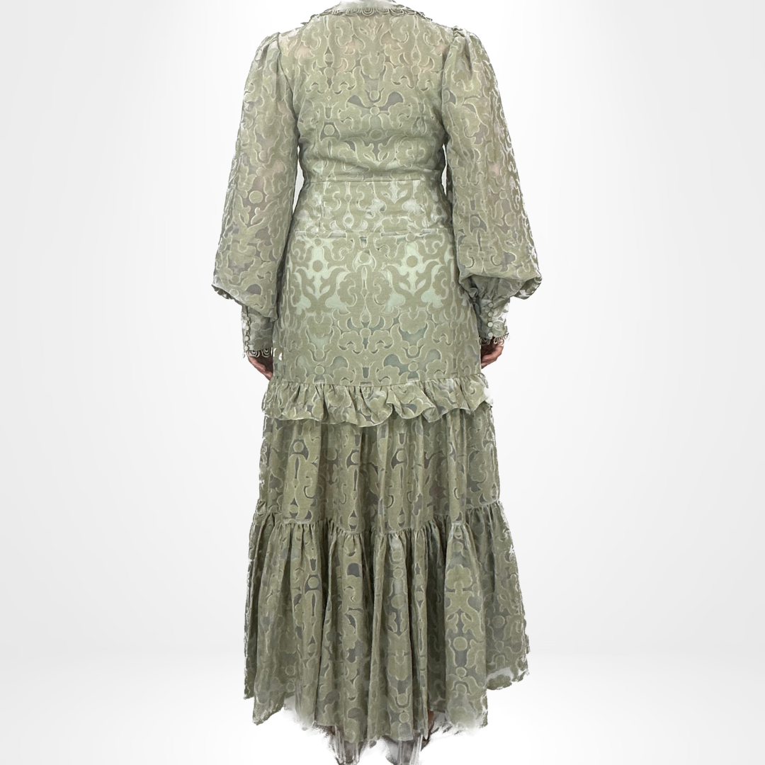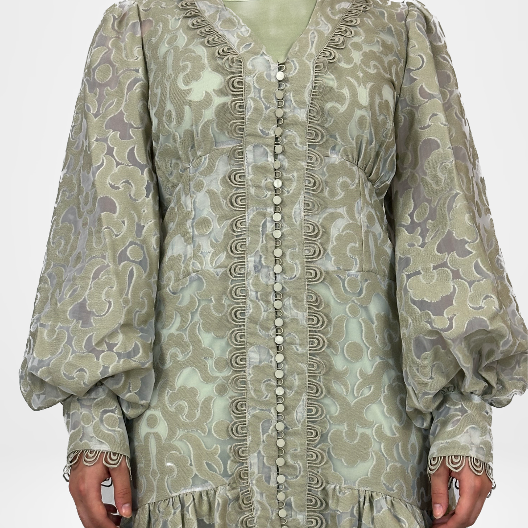 Elevate your look with our Moonlit Sage Dress. Made from moonlit sage organza, this dress exudes modern elegance. Its airy texture and lantern sleeves offers a charming and sophisticated touch, perfect for any occasion. Experience the beauty of understated luxury in our organza dress.
