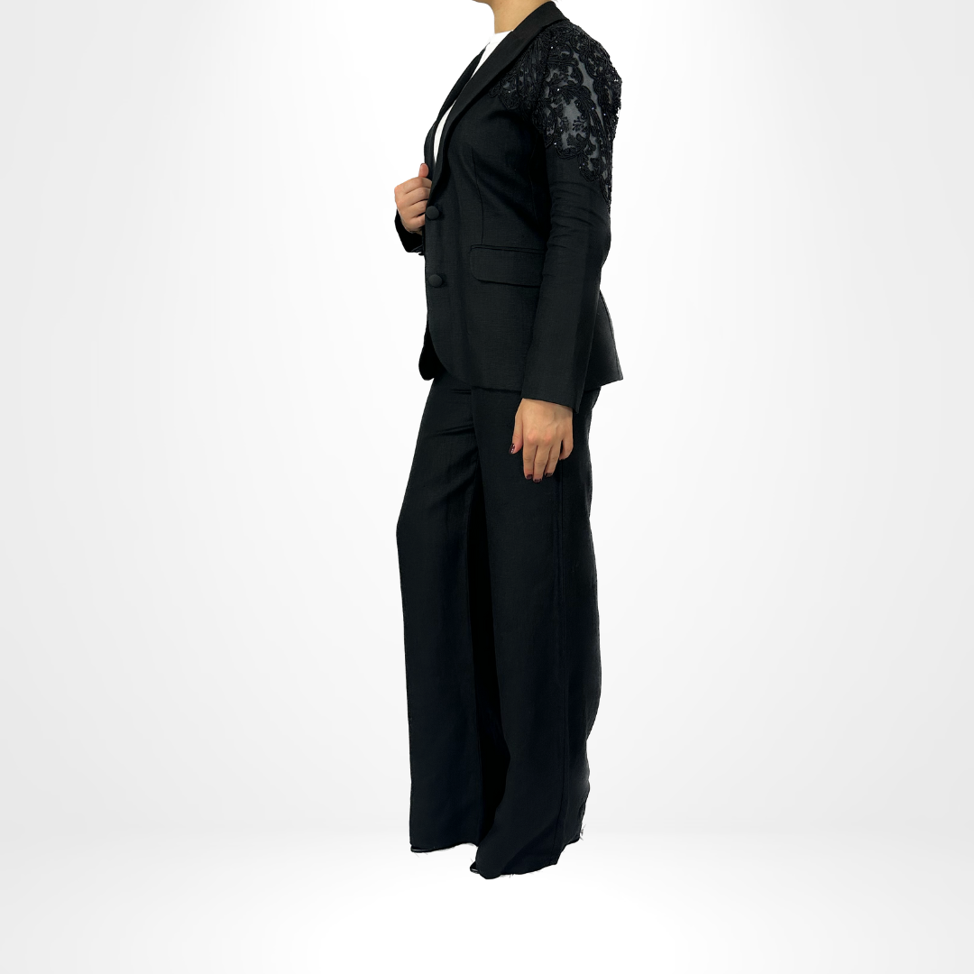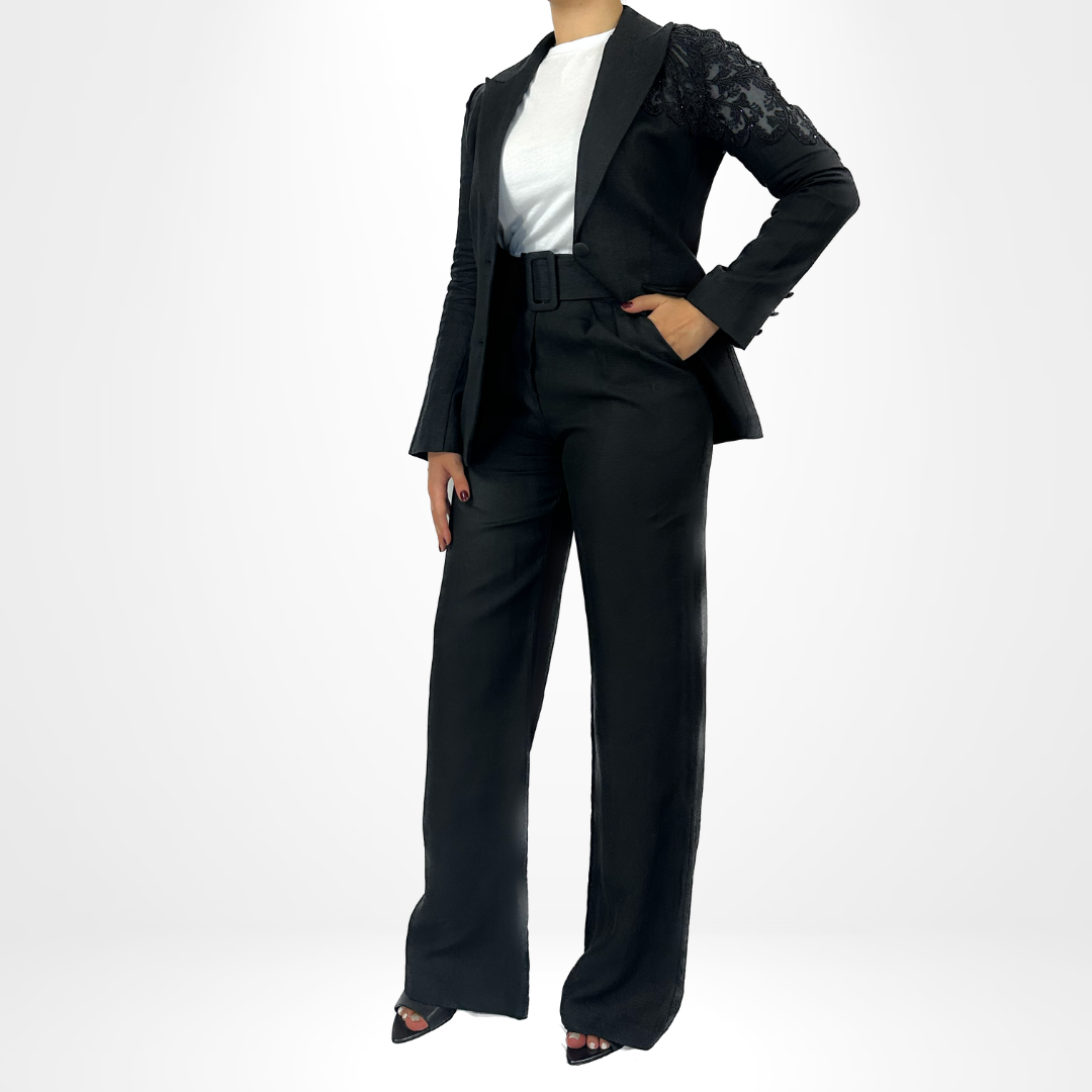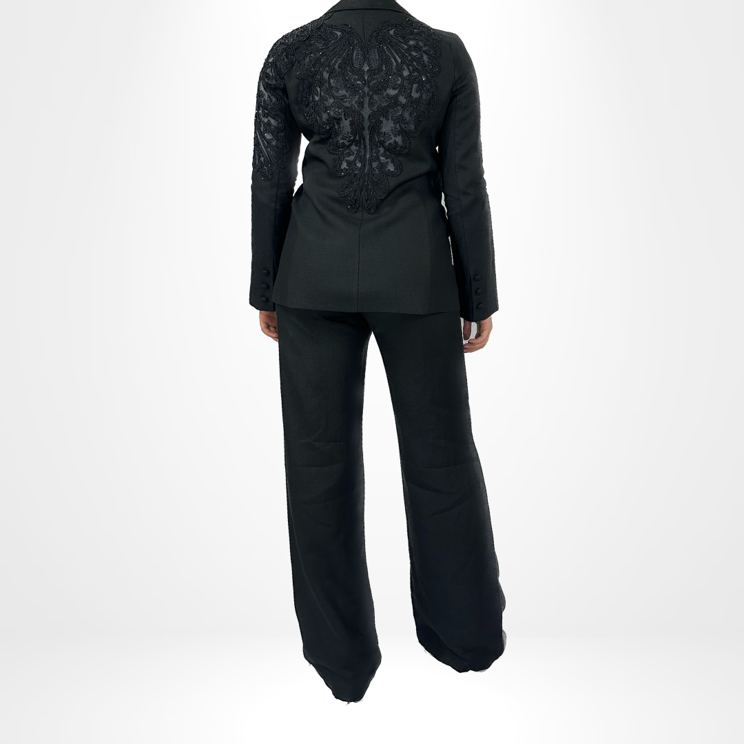 Upgrade your wardrobe with the Midnight Majesty Set. This sleek and stylish blazer and pant set features unique detailing on the sleeve and back, adding a touch of sophistication and elegance to your outfit. Perfect for any formal or professional occasion.