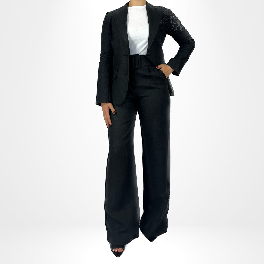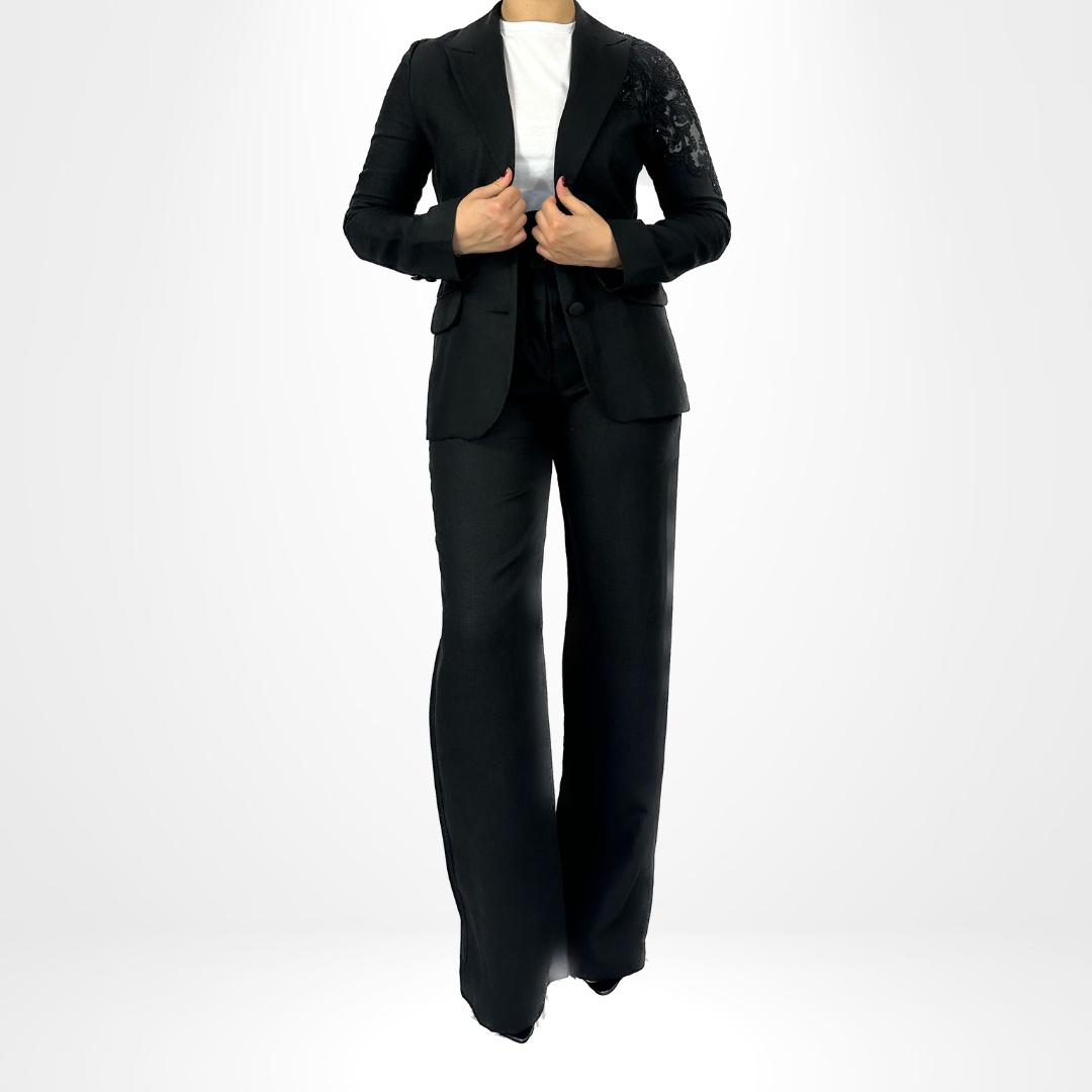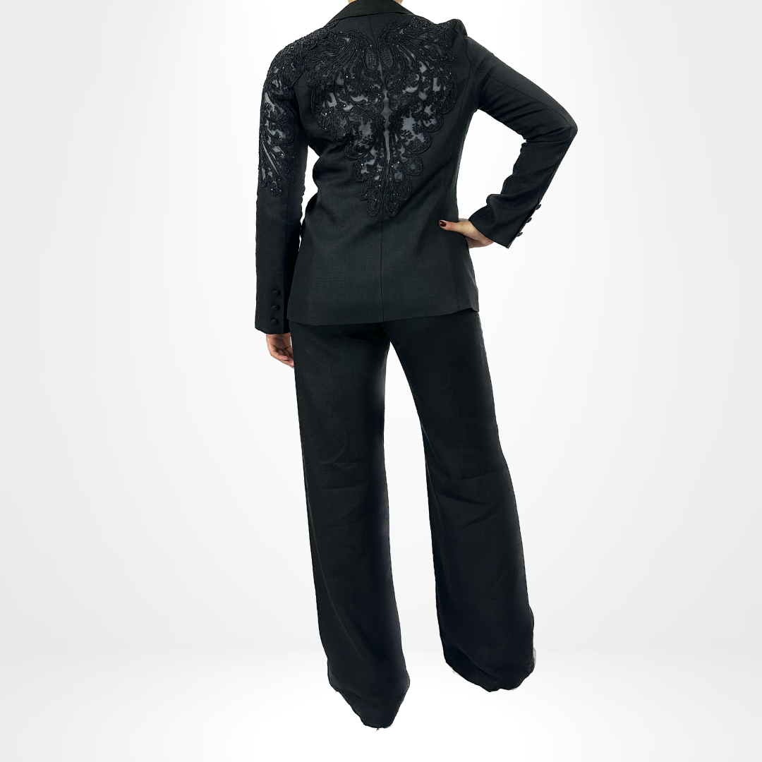 Upgrade your wardrobe with the Midnight Majesty Set. This sleek and stylish blazer and pant set features unique detailing on the sleeve and back, adding a touch of sophistication and elegance to your outfit. Perfect for any formal or professional occasion.