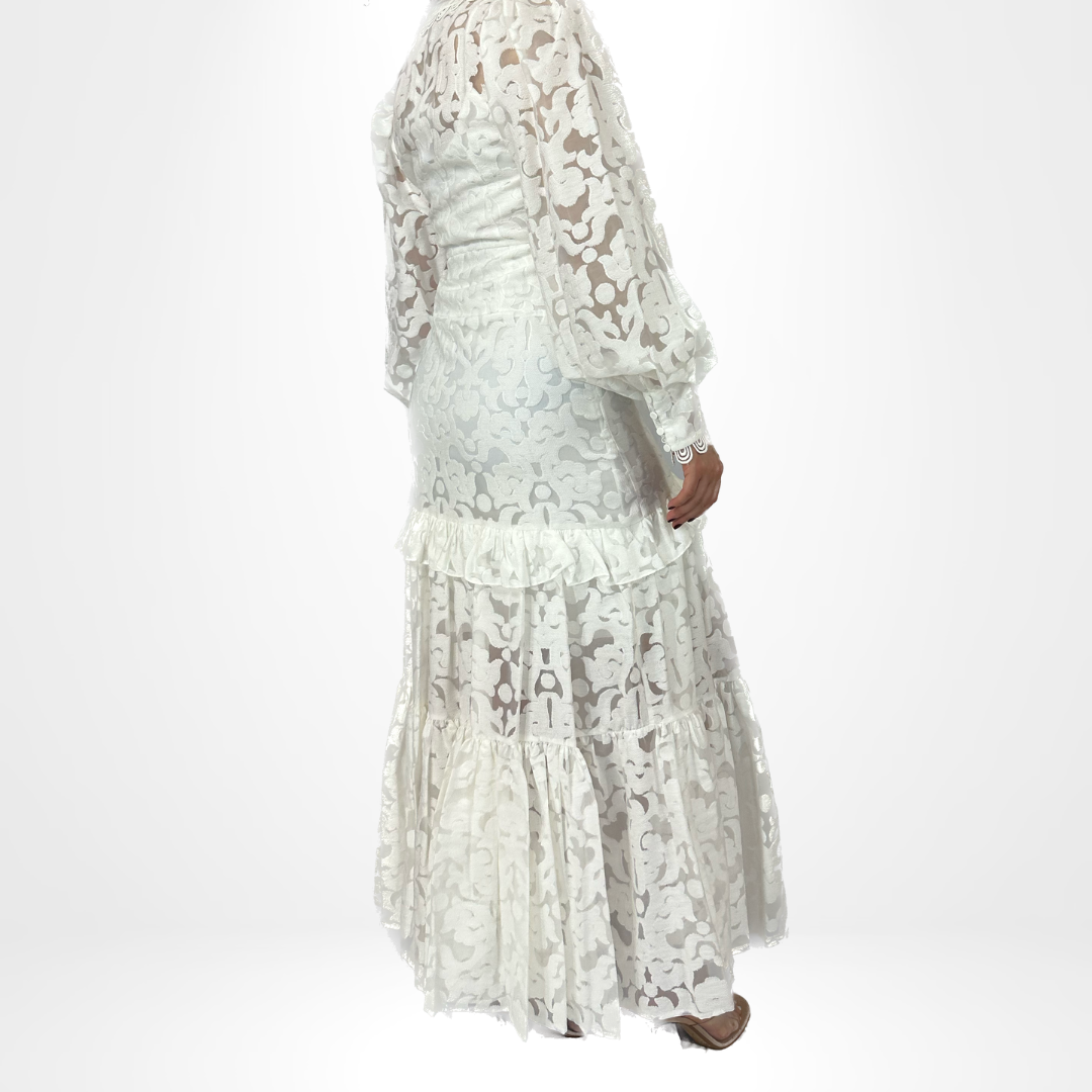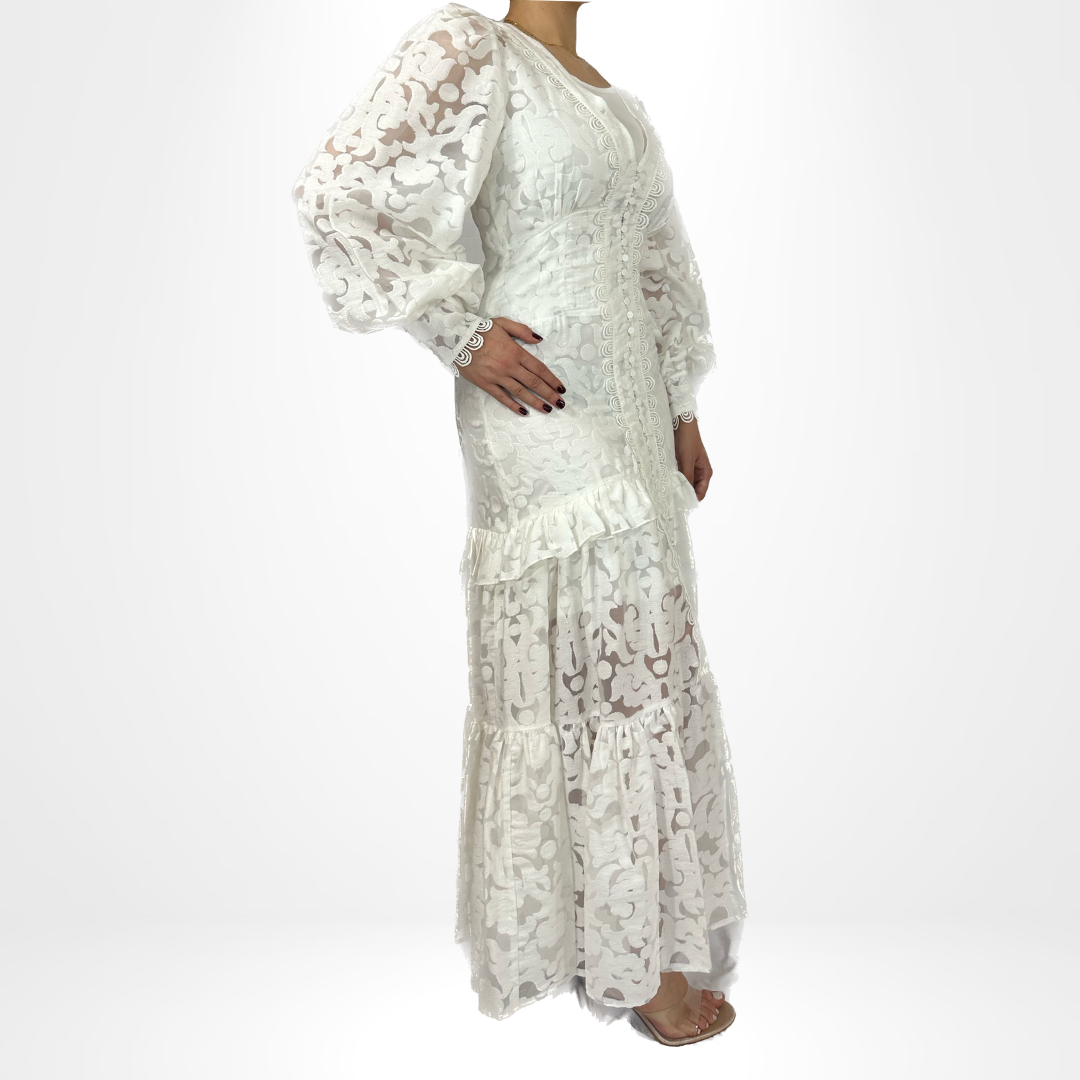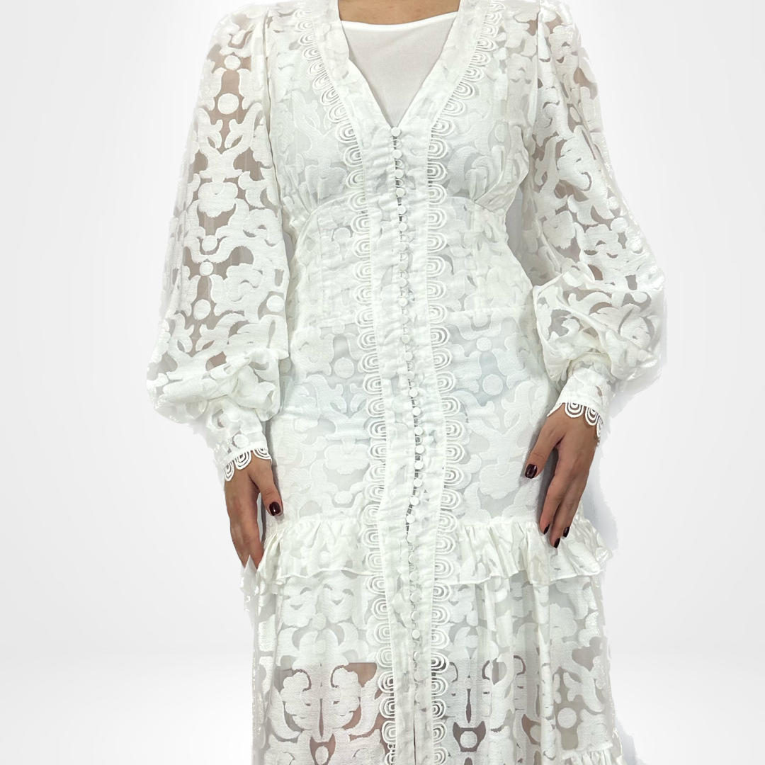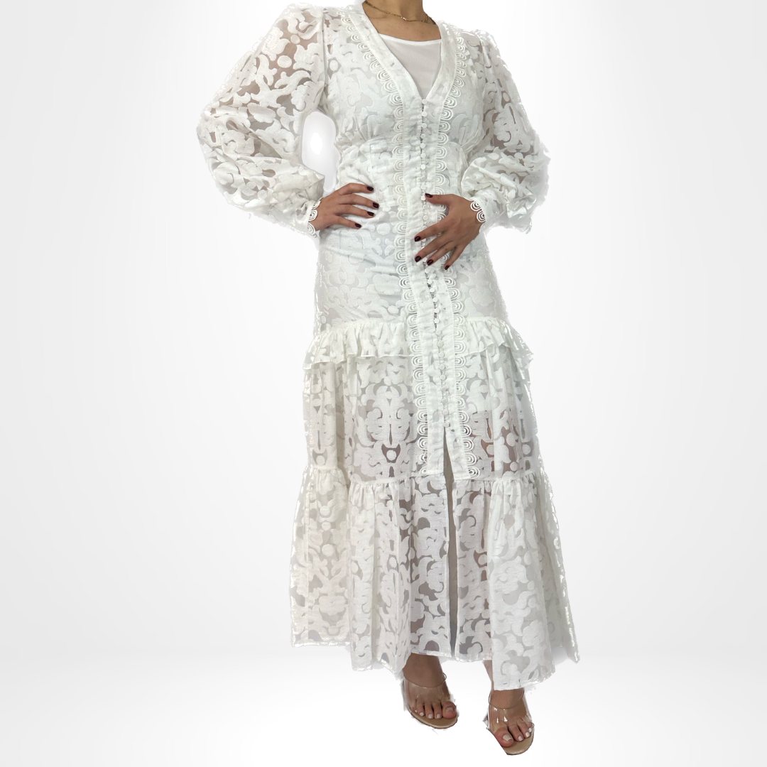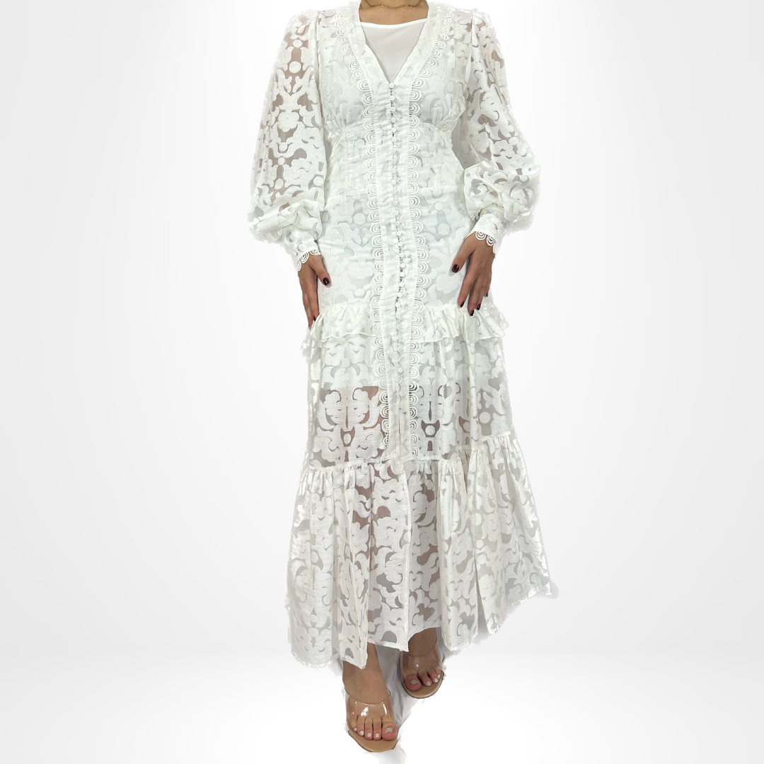 Elevate your wardrobe with our stunning Moonlit Pearl Dress. Made from a luxurious organza blend, this white dress features balloon sleeves and intricate detailing. The removable short liner allows for versatile styling options. Perfect for any special occasion, this dress will make you feel elegant and confident.
