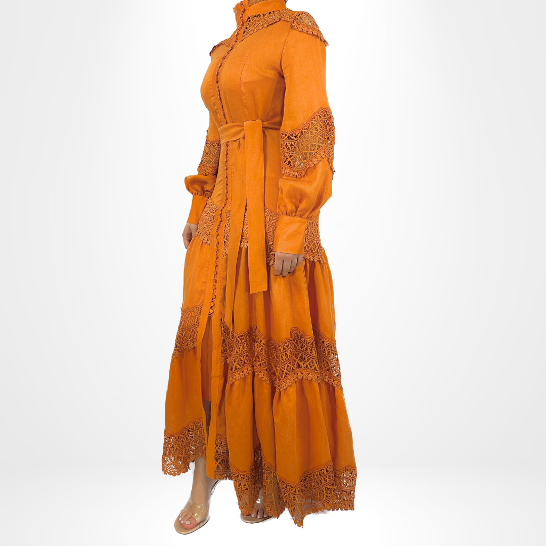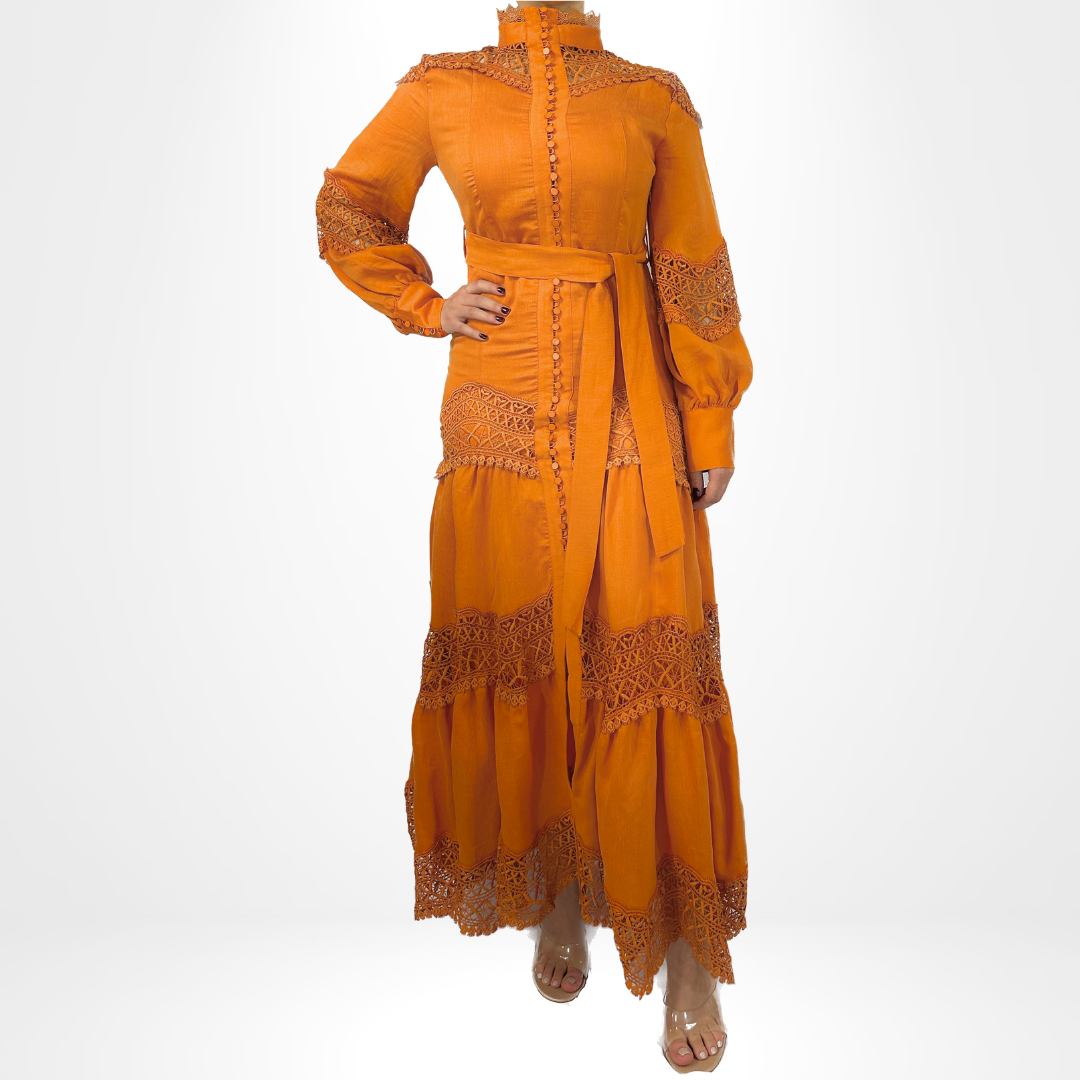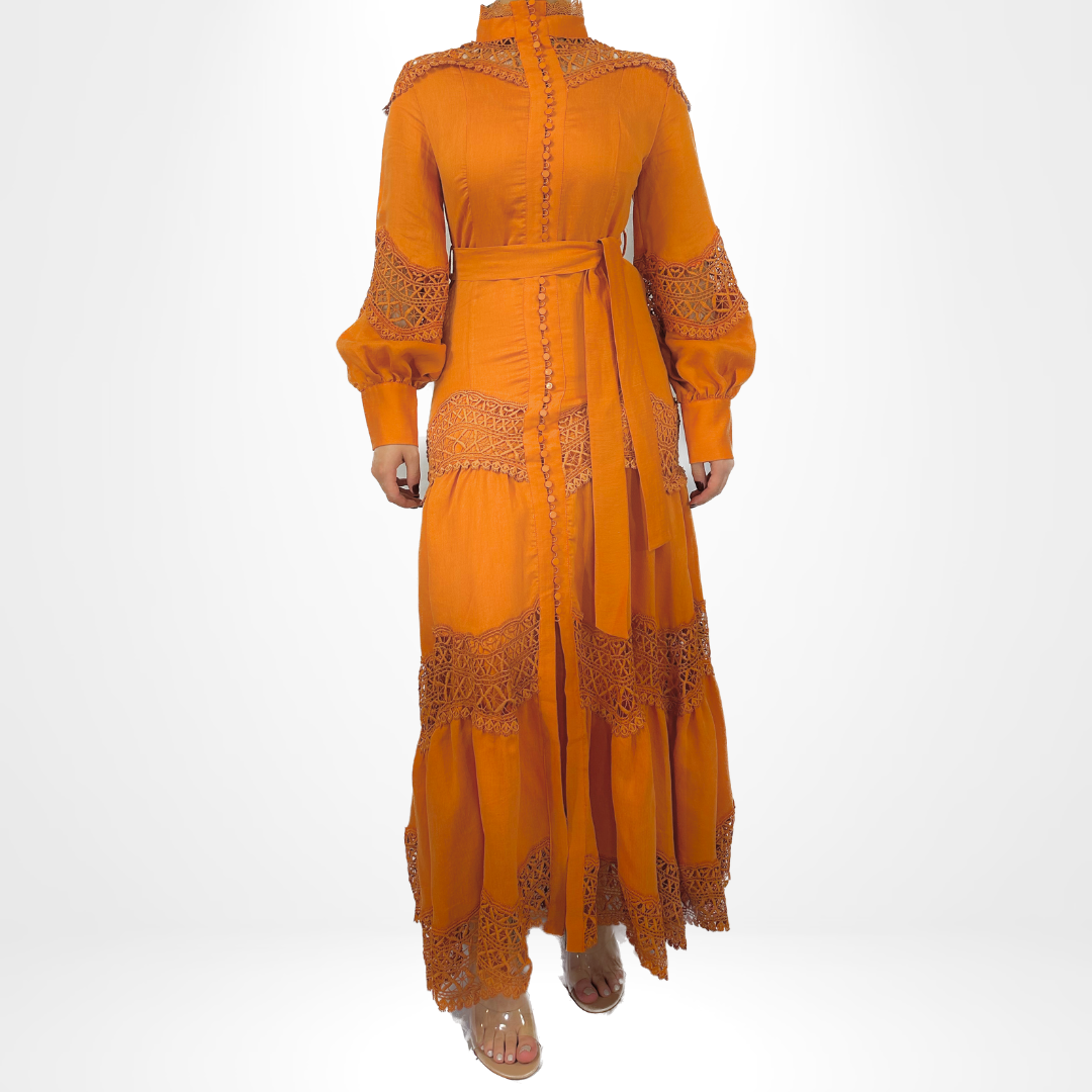 Elevate your style with our Amber Elegancy Dress. This long dress boasts a high neck and intricate detailing on the sleeves and skirt. Available in various colors, it comes with a belt for a customizable fit. Perfect for any occasion, exude elegance and charm with this stunning piece.