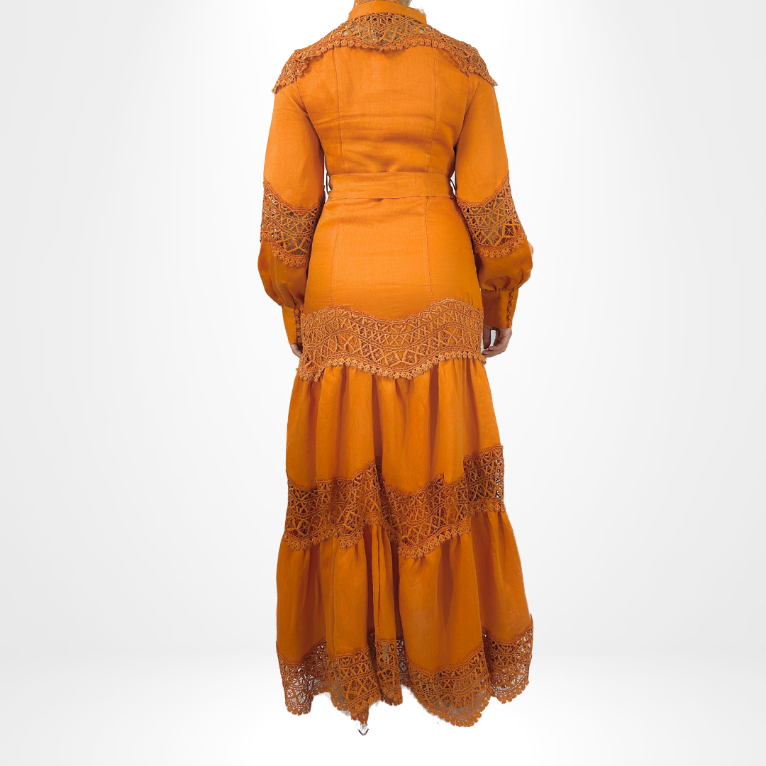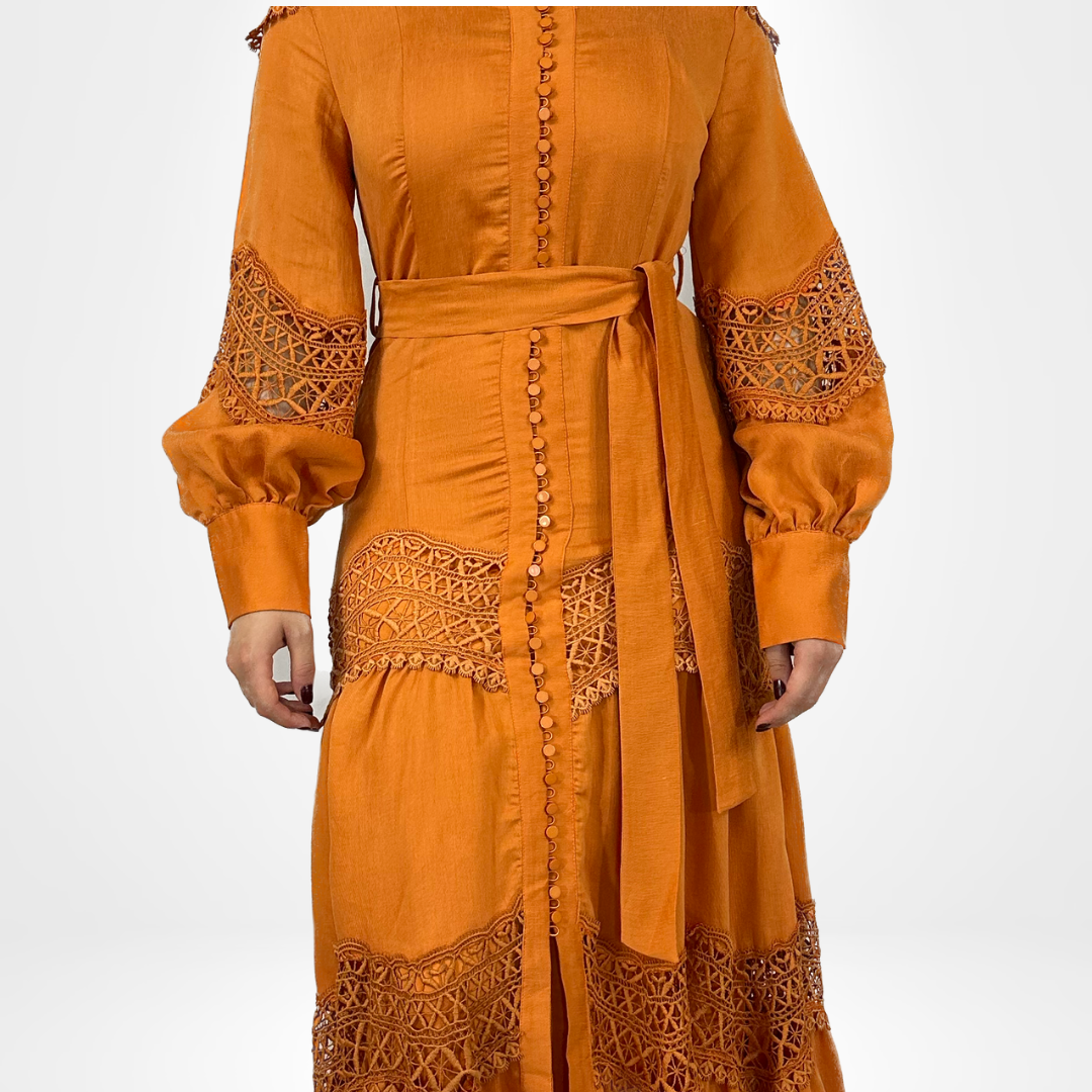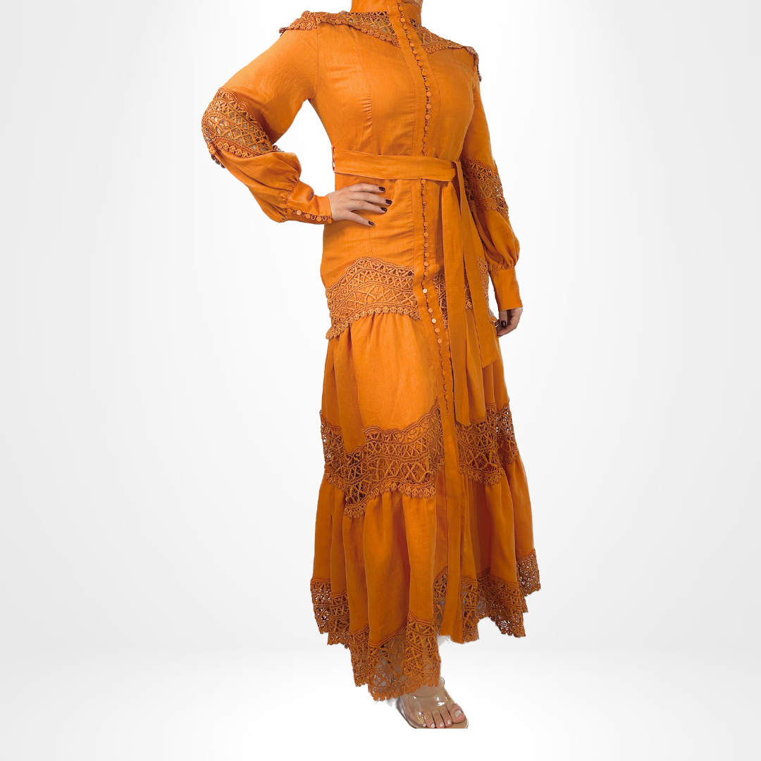 Elevate your style with our Amber Elegancy Dress. This long dress boasts a high neck and intricate detailing on the sleeves and skirt. Available in various colors, it comes with a belt for a customizable fit. Perfect for any occasion, exude elegance and charm with this stunning piece.