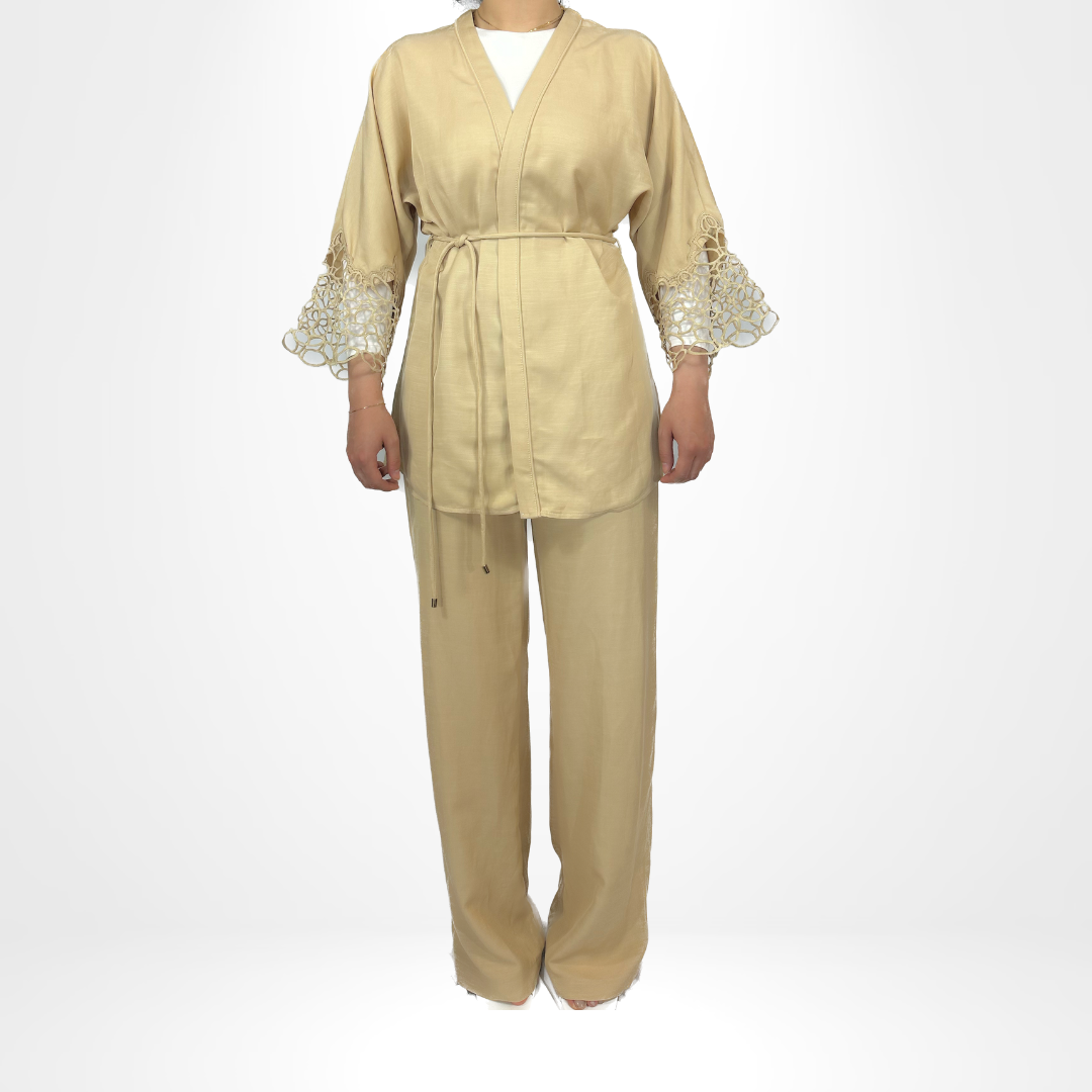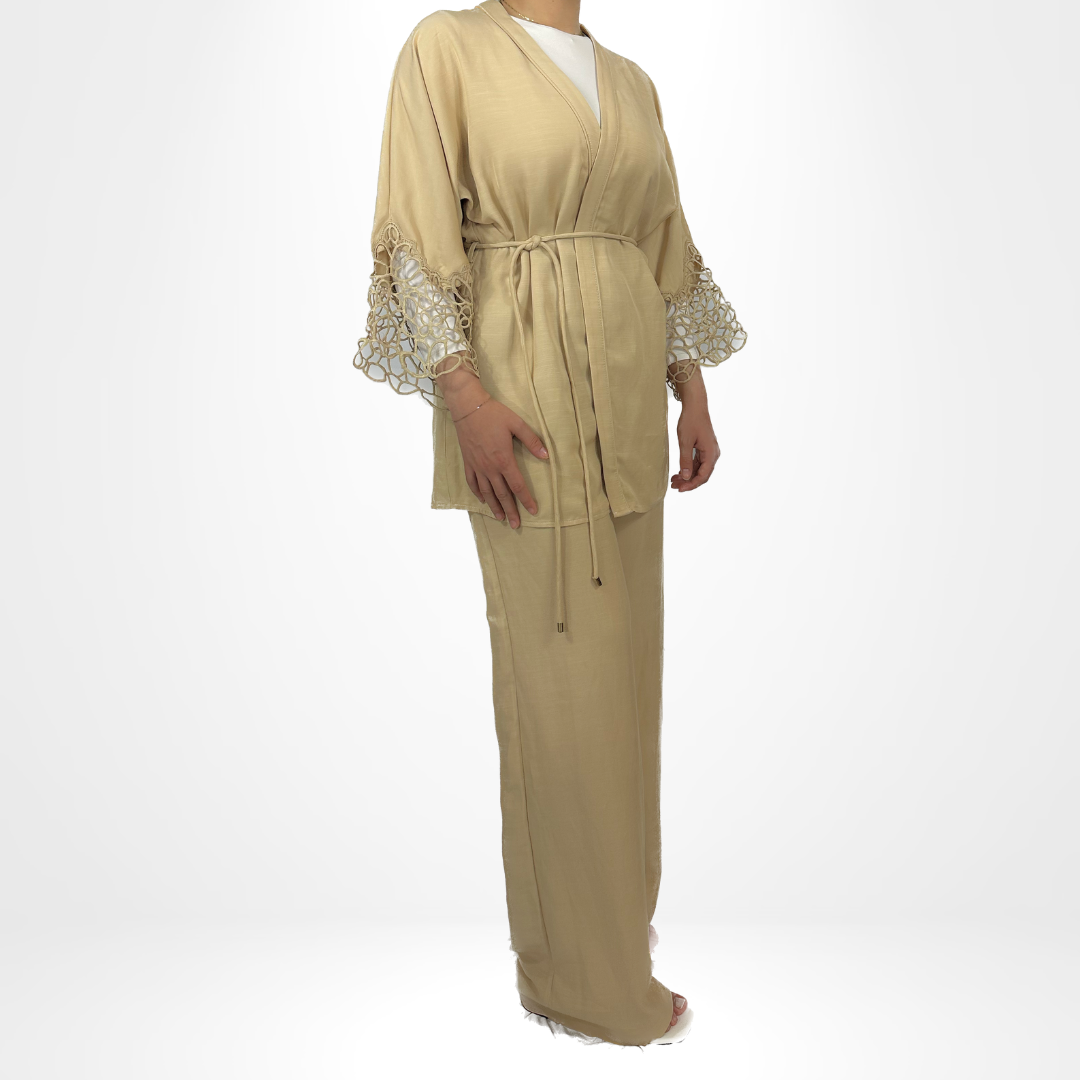 Unleash your chic style with our Sandstone Ensemble. This two piece set features detailed sleeves and a modest design, perfect for any occasion. Complete the look with the included tie belt. Available in multiple colors for versatile wear options. Elevate your wardrobe with Amber.